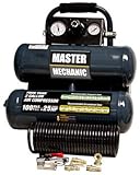 Master Mechanic, 2 Gallon, Twin Tank, Air Compressor, 2A, .33 HP, 1.0 SCFM @ 40 PSI, .50 SCFM @ 90 PSI, Hybrid Induction Type Motor For Long Life & Quiet Operation 75dB, 100 PSI Maximum, Oil Free Compressor, Lightweight/Portable, Low Profile Stable Design On Rooftops Or When Transporting, Includes: 25' Polyurethane Coil Air Hose, 1/4" Female Coupler, Two 1/4" Male Fitting, Tire Inflator, Air Blower, Air Blower Adaptor, Inflating Nozzle & Inflating Needle, 1 Year Warranty.