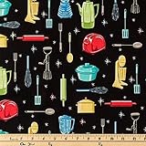 This valance is made with a black with retro kitchen appliances fabric. -- Valance is approximately 42 inches wide, 14 inches long, and has a 2 inch rod pocket. -- If you want your valance to have a gathered look I suggest purchasing enough valances so that the combined width is 1 1/2 -2 times the width of your window. -- It is best to purchase them at the same time so I can ensure that your valances match up nicely. -- Looking for a custom design or size that you don't see in my shop? Send me a message and I would love to work with you! I can do custom valances, curtains, throw pillow covers, and more.